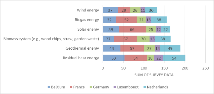 Figure 1 — Residual heat scores highest across all countries surveyed, followed by geothermal energy. These are promising but complex technologies where location-specific, reliable information remains hard to find.